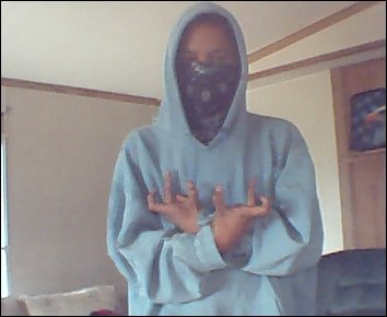 A member of the Gangsta Disciple Nation(To Represent: flag colors=Blue+Black;Hat or anything that can be is cocked to the right; pitchforks up; Under the Six Point Star of King David);